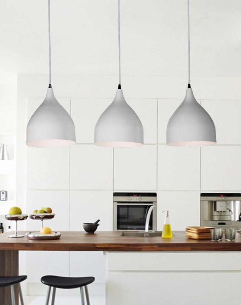 想维持清爽就用设计简洁轻巧的吊灯,它能照顾到整个餐厨空间,不同于吸顶灯,它的改造作用十分明显。餐桌放窗下,晒着太阳吃美食;拉上窗帘打开吊灯,还可以享受灯光聚合的温馨。