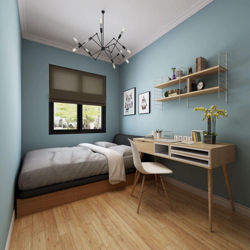 3、双人主卧室的最标准面积=12㎡,夫妻二人的卧室不能比这个再小了,在这样的房间里除了放一张必备的床以外,还可以放一个双开门的衣柜(120*60)和两个床头柜。