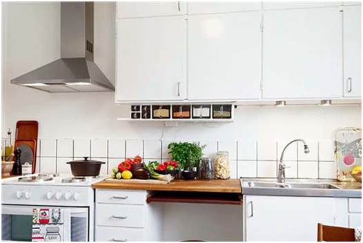 厨房收纳时巧妙地利用墙面,可以给你增加不少储物空间。尽可能将各种勺子、烹饪用具甚至是调料悬挂起来,整洁有序之余,让物品呈现在我们面前方便使用。如果是无法悬挂的物品,可以在台面上层的墙面上安装一排置物架,将不能悬挂的瓶瓶罐罐放上去,这样就相当于增多了一层台面空间。