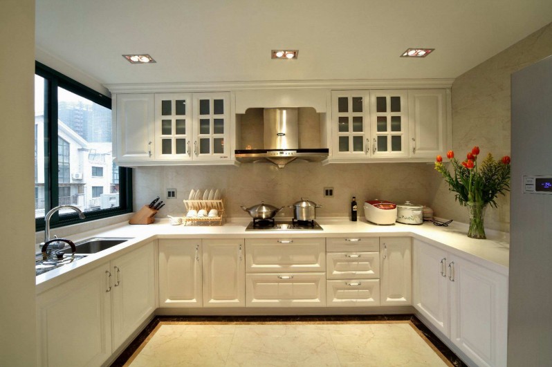 厨房中的光线也是很重要的,如果是单一的照明,光线就会显得很暗,特别是中餐是很注重“色”的,因此厨房中的光线一定要足够明亮、充足,光线的颜色尽量选择白色,这样除了对厨房的照明之外,在洗涤区、操作台的位置,可以增设橱柜专用的射灯,做好补充照明的作用,以方便在做饭的时候有充足的光源。