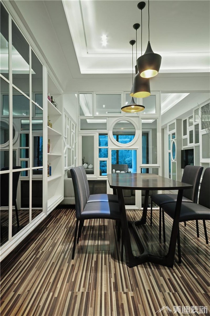 在餐厅背景采用大量茶镜;顶面设计采用简洁、有力的线条,延续其原有建筑结构的美感。没有过多色彩和装饰,却赋予空间更宽阔的视觉感受。