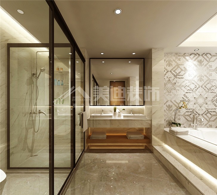 墙面是占据整个空间大部分面积,而整体色彩会给人先入为主的既视感,因此,提升的关键要从墙面开始,在颜色上,宜选用清冷淡雅色调,除给人以干净清爽之感外,也会增加空间感,如不规则条纹大理石,让整个卫生间充满随性,轻松