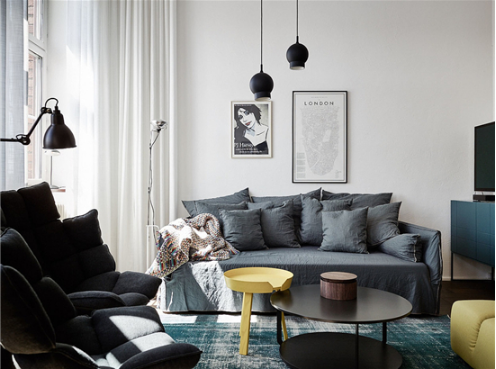 灰色爱上蓝色。灰色能够衬托蓝色的明亮,而蓝色能突显灰色的质感,再来一点黄色,点亮整个空间。