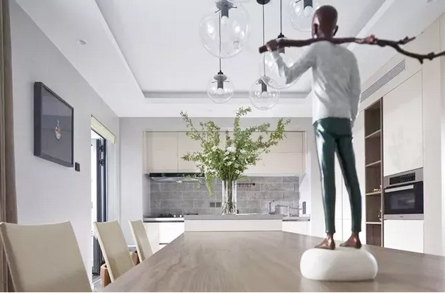 步入餐厅,一幅云雾缭绕、远山层叠的中国水墨画在空间中铺展开来,它与简洁的白色空间,相映成趣,再缀以一抹清新的绿意,田园牧歌式的生活即刻在眼前上演。
