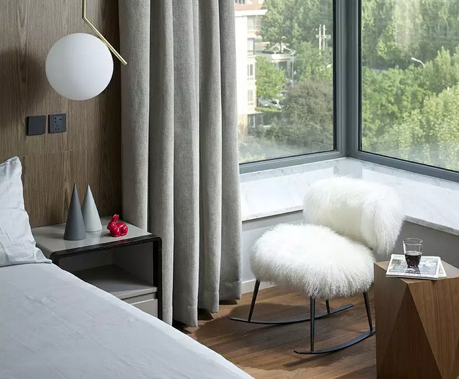 “木材是最有人情味的材料”,主卧的墙面以及地面均采用实木作为装饰,它所散发的温润质感,给人古朴、温暖的感觉。随性的视觉陈列方法,将椅子、茶几与床之间形成错落有致的比例,让原本古朴的空间多了几份灵动之感。